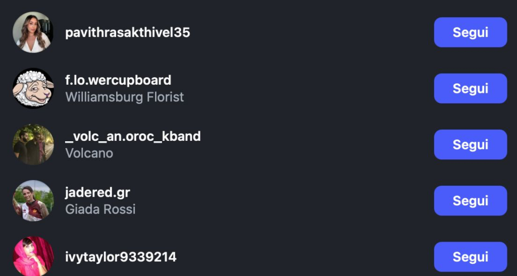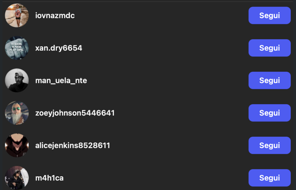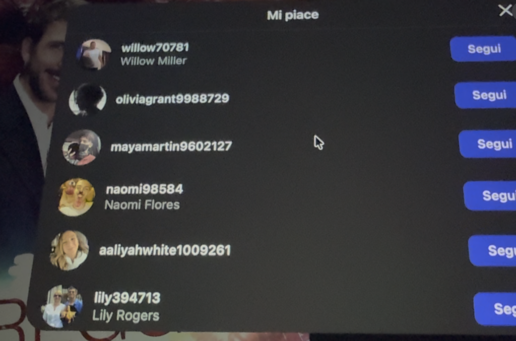Molte interazioni controllate sotto le card di Nacy Brilli proverrebbero da account con nomi alfanumerici, privi di contenuti e con pochissimi o zero follower: profili che ricordano da vicino i cosiddetti “bot”.